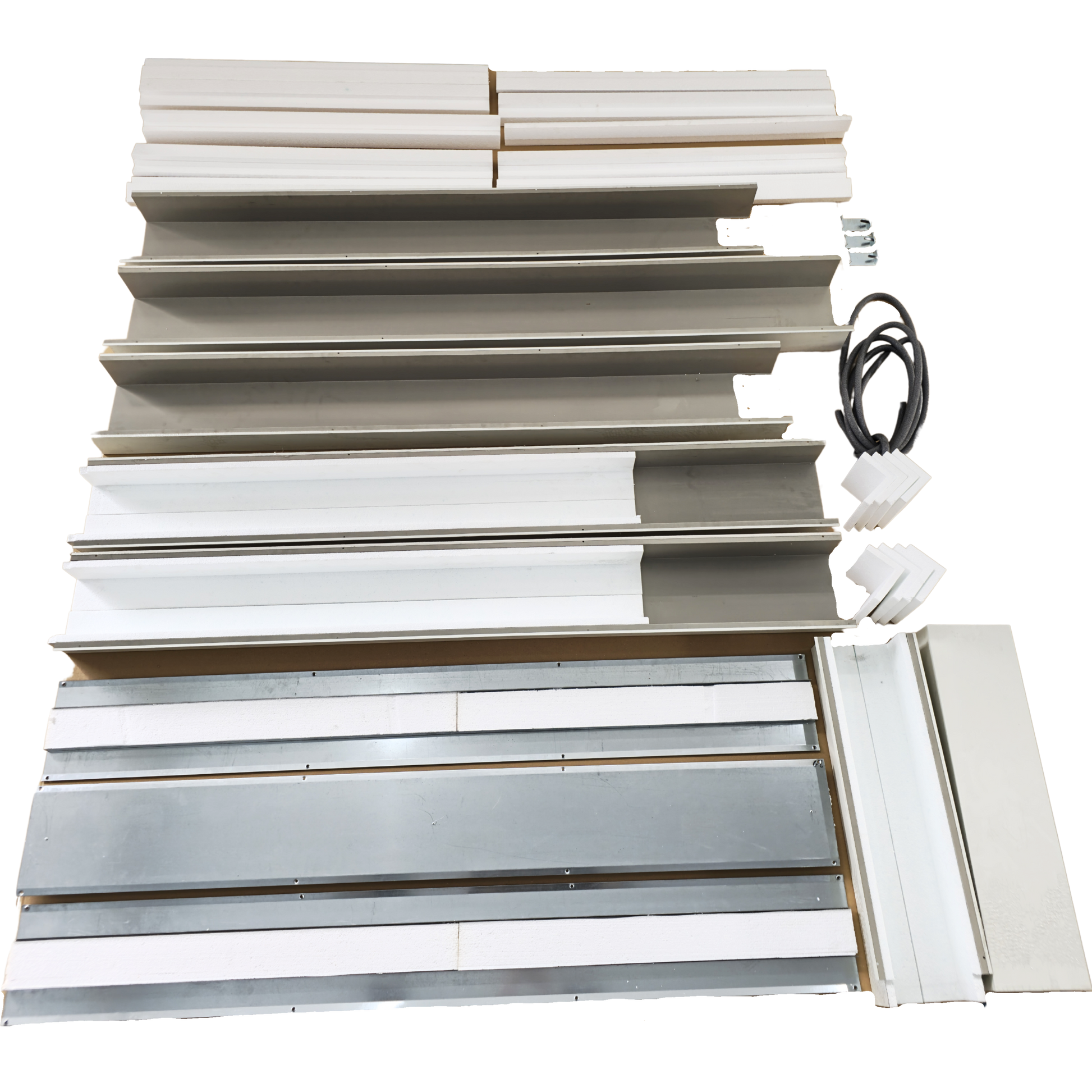 This set is for 20 feet container and completely covers the open sides of two container modules. The wall and roof tunnels can be overlapped and can therefore be used for interior room heights of 235cm to 254cm. All elements are coated with EPS on the inside.
